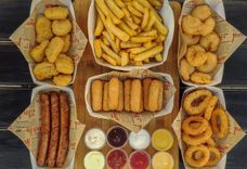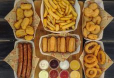 (1390гр) Картофель (400 г), наггетсы (10 шт.), креветки (10 шт.), палочки моцарелла (10 шт.), колбаски из птицы (3 шт.), луковые кольца (10 шт.), соусы (кетчуп, сырный, горчичный) (3 шт.)